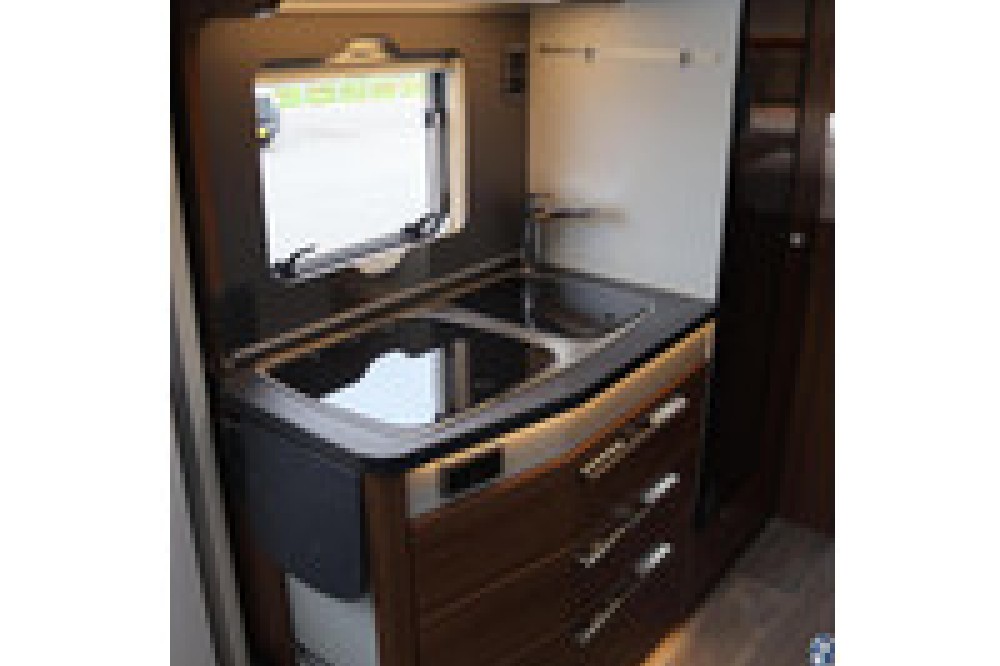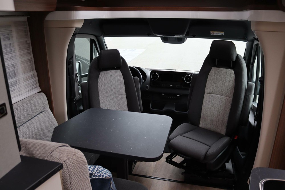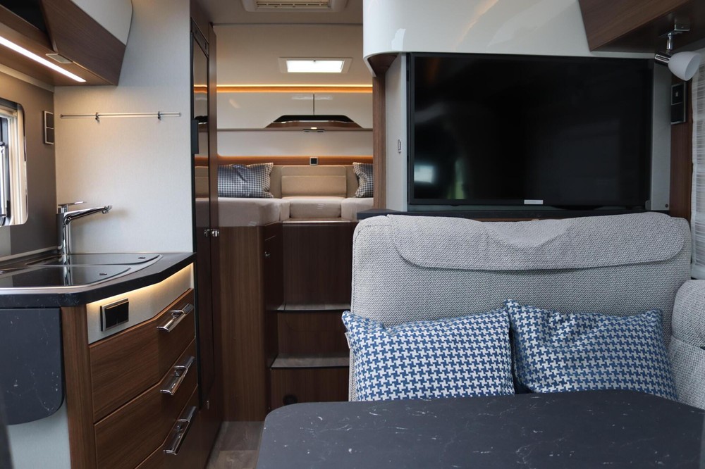 Luxe en praktische detailsDe Hymer BMC-T 580 biedt een ruime zithoek met een L-zit die ontstaat door de draaibare voorstoelen. Het elegante Noce Cognace meubeldecor in combinatie met de luxe Kitami bekleding zorgt voor een verfijnde uitstraling. Dankzij de dubbele bodem, die verwarmd is en extra opbergruimte biedt, kun je jouw spullen veilig en droog opbergen. De 180 liter schoonwatertank en de 150 liter vuilwatertank zijn weggewerkt in de dubbele bodem, terwijl je vanuit de buitenkant eenvoudig toegang hebt tot de opslagruimte. De ruime garage heeft een laadhoogte van 132 cm, is aan beide zijden toegankelijk en biedt voldoende ruimte voor uw fietsen, scooter en bagage.