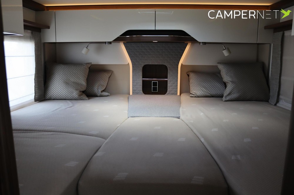 De nieuwe HYMER panorama-handmatige dakluifel, die in alle camper-modelseries wordt toegepast, scoort met nog meer hoofdruimte door zijn lagere opbouw. Door deze te integreren in het ontwerp van de woonruimte en, afhankelijk van de indeling, met extra sfeerverlichting, past hij perfect in het harmonieuze totaalbeeld van de voertuigen. Dankzij de best mogelijke bescherming tegen regen laat hij permanente ventilatie toe, maar ook schokventilatie wanneer hij wordt gekanteld. Het is ook achterwaarts compatibel met het bestaande HYMER handmatige dakluik.