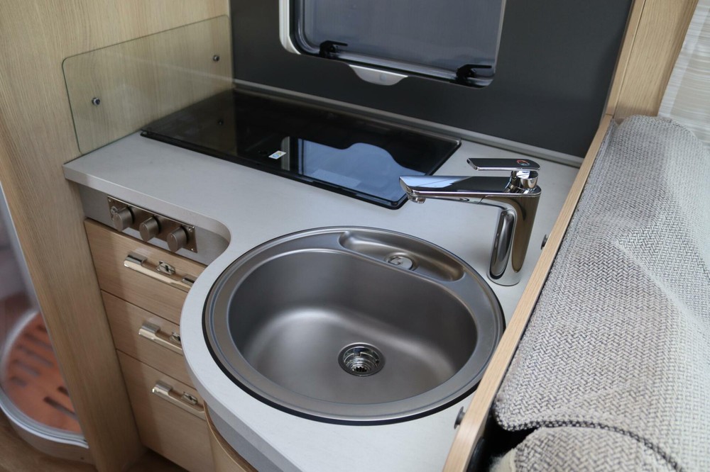 Luxe en praktische detailsDe Hymer BMC-T 690 biedt een ruime zithoek met een L-zit die ontstaat door de draaibare voorstoelen. Het elegante Grand Oak meubeldecor in combinatie met de luxe Kitami bekleding zorgt voor een verfijnde uitstraling. Dankzij de dubbele bodem, die verwarmd is en extra opbergruimte biedt, kun je jouw spullen veilig en droog opbergen. De 180 liter schoonwatertank en de 150 liter vuilwatertank zijn weggewerkt in de dubbele bodem, terwijl je vanuit de buitenkant eenvoudig toegang hebt tot de opslagruimte. De ruime garage heeft een laadhoogte van 132 cm, is aan beide zijden toegankelijk en biedt voldoende ruimte voor uw fietsen, scooter en bagage.