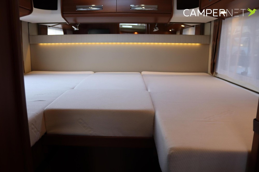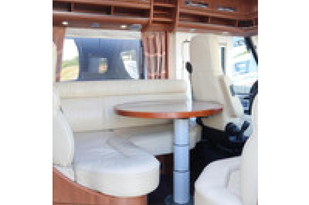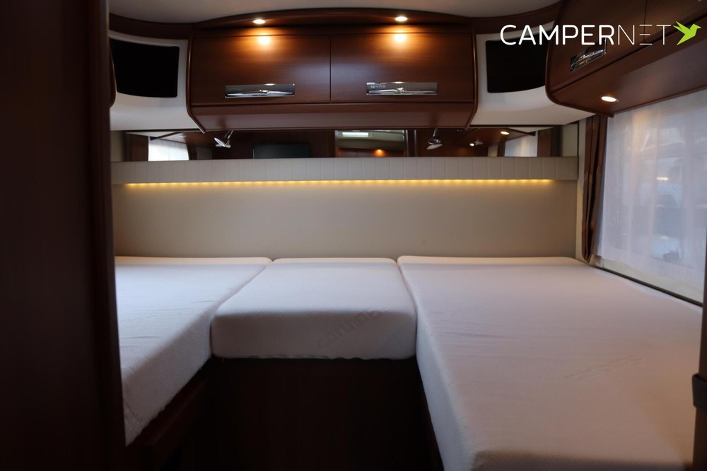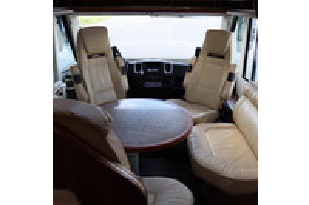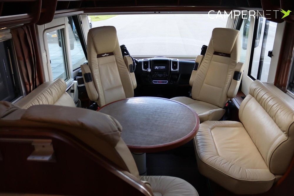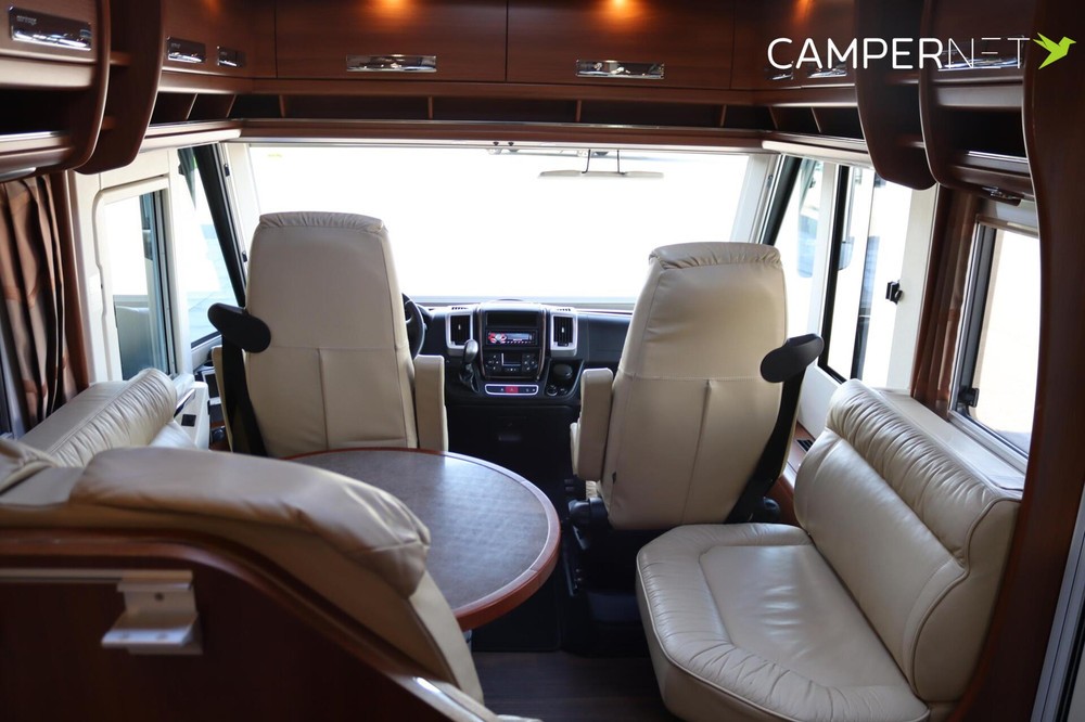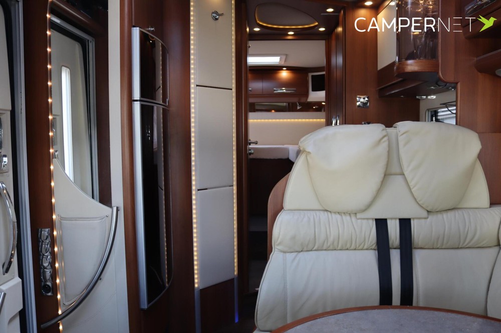 Het woongedeelte is voorzien van een luxe, ruime rondzit en een volledig verstelbare tafel. Achterin vindt u de royale lengtebedden boven de grote garage, die toegang biedt via twee deuren. Het interieur heeft een verfijnde uitstraling met leren bekleding, gecombineerd met houten meubelpanelen met een chique afwerking en chroomdetails. De geïntegreerde elektrische opstap maakt in- en uitstappen gemakkelijk.