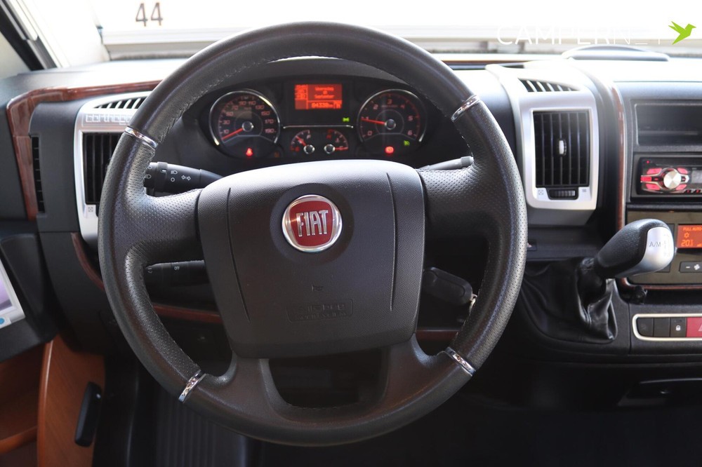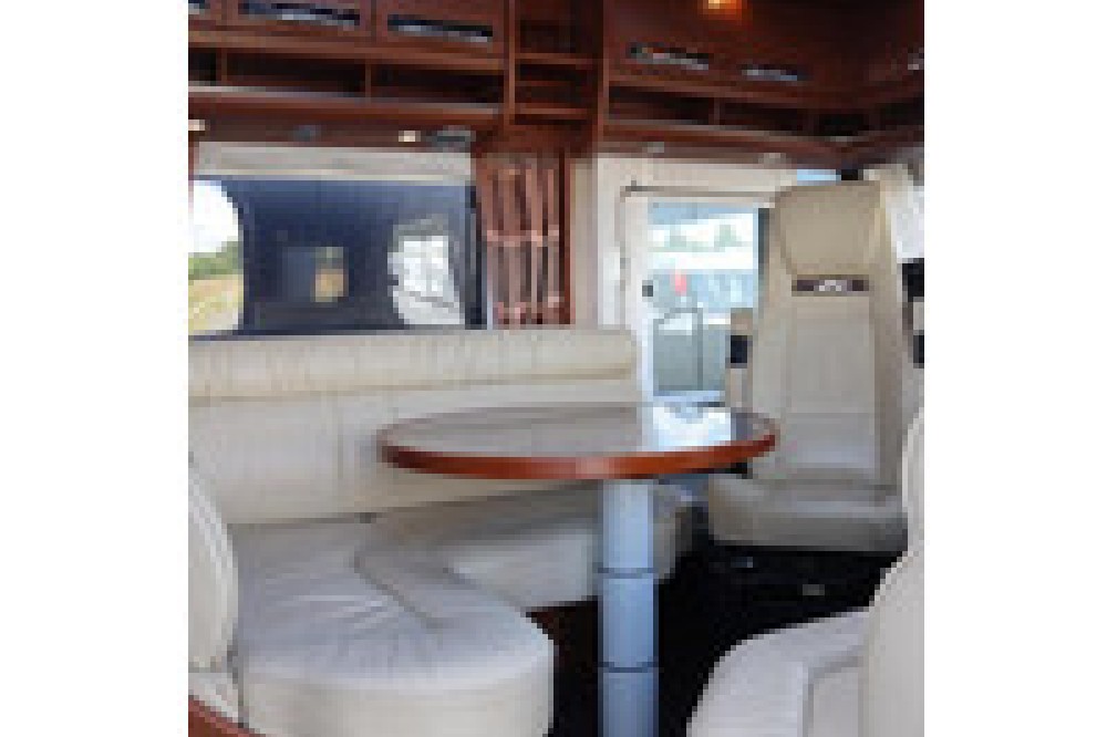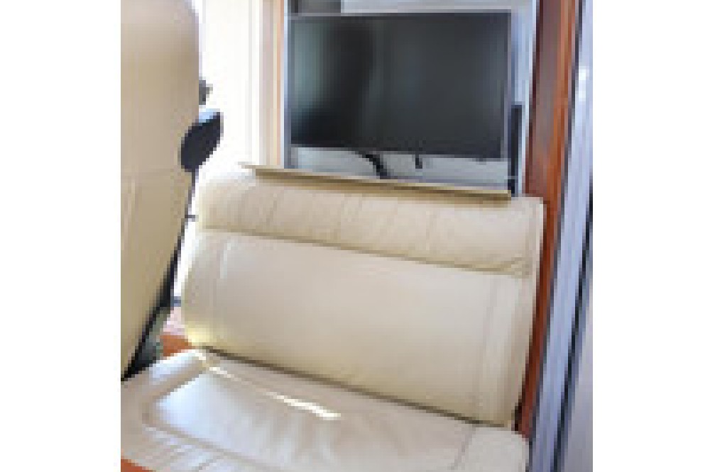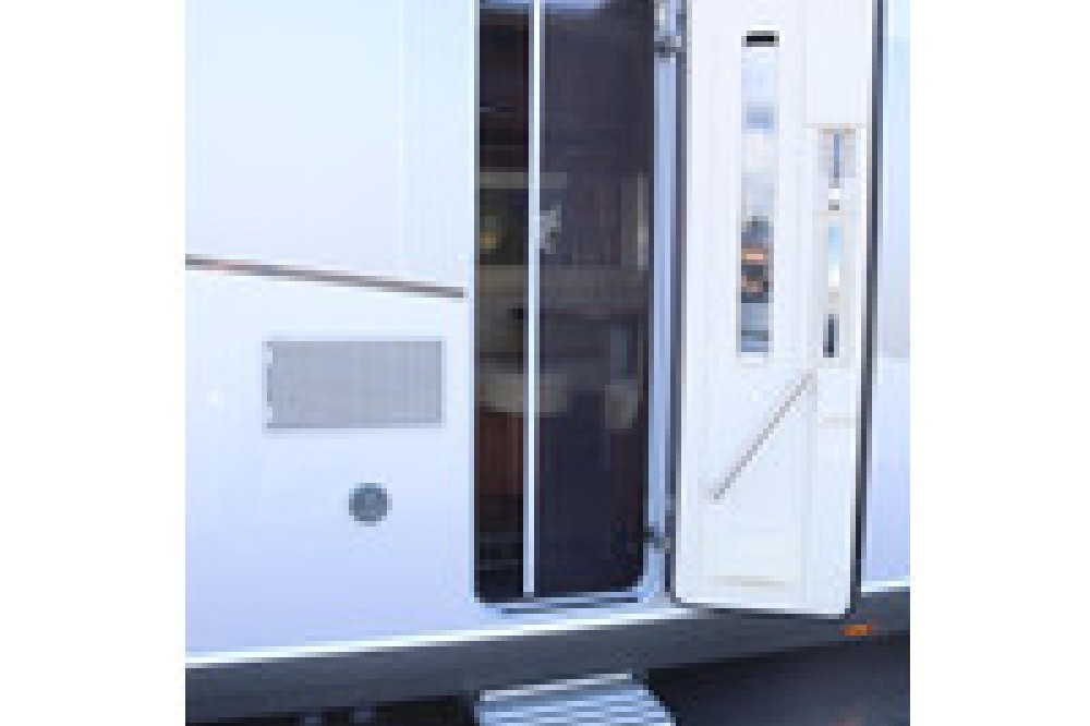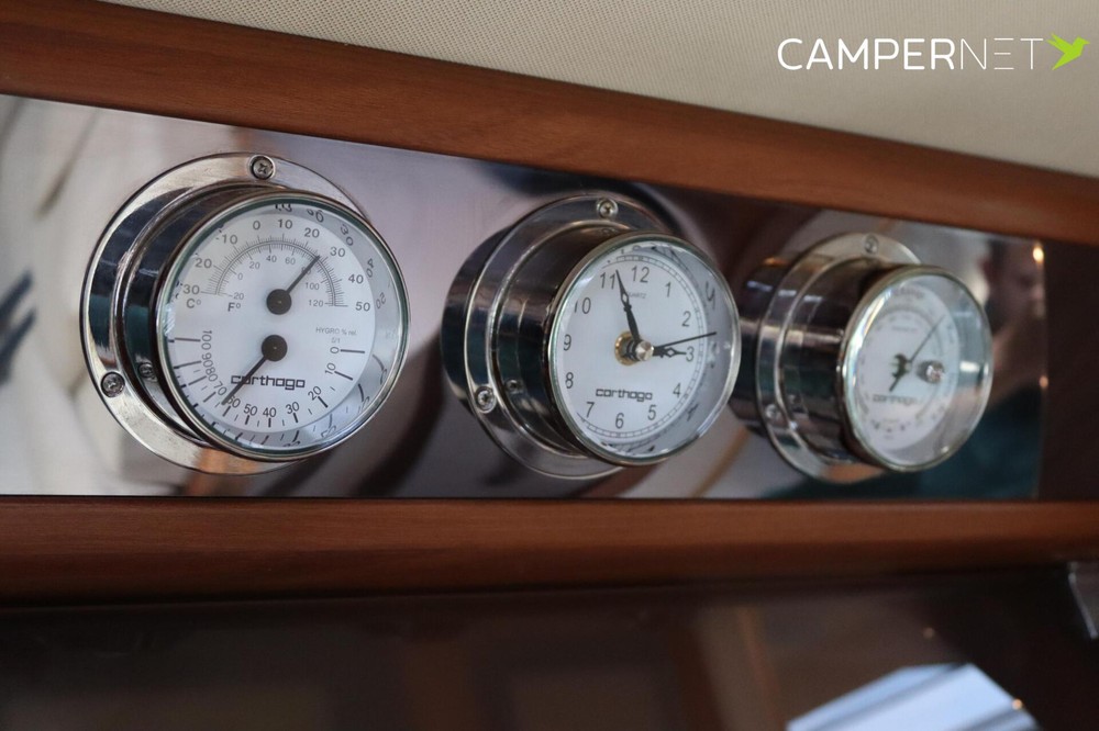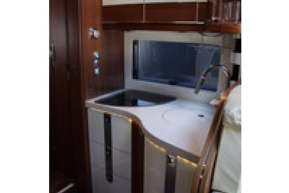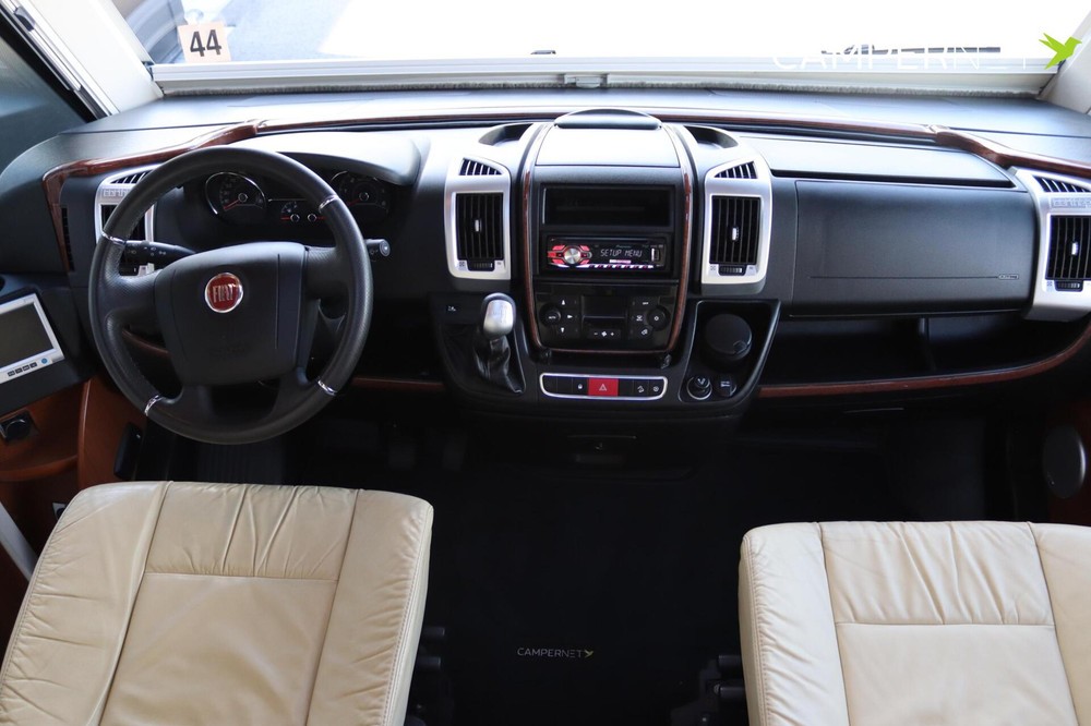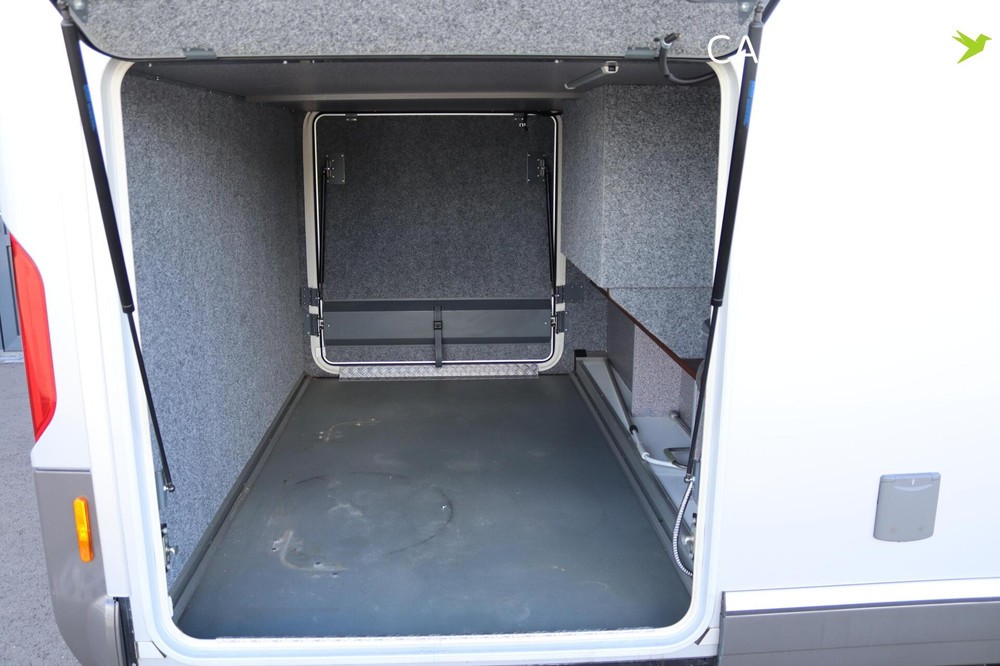 Het woongedeelte is voorzien van een luxe, ruime rondzit en een volledig verstelbare tafel. Achterin vindt u de royale lengtebedden boven de grote garage, die toegang biedt via twee deuren. Het interieur heeft een verfijnde uitstraling met leren bekleding, gecombineerd met houten meubelpanelen met een chique afwerking en chroomdetails. De geïntegreerde elektrische opstap maakt in- en uitstappen gemakkelijk.