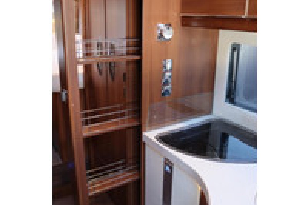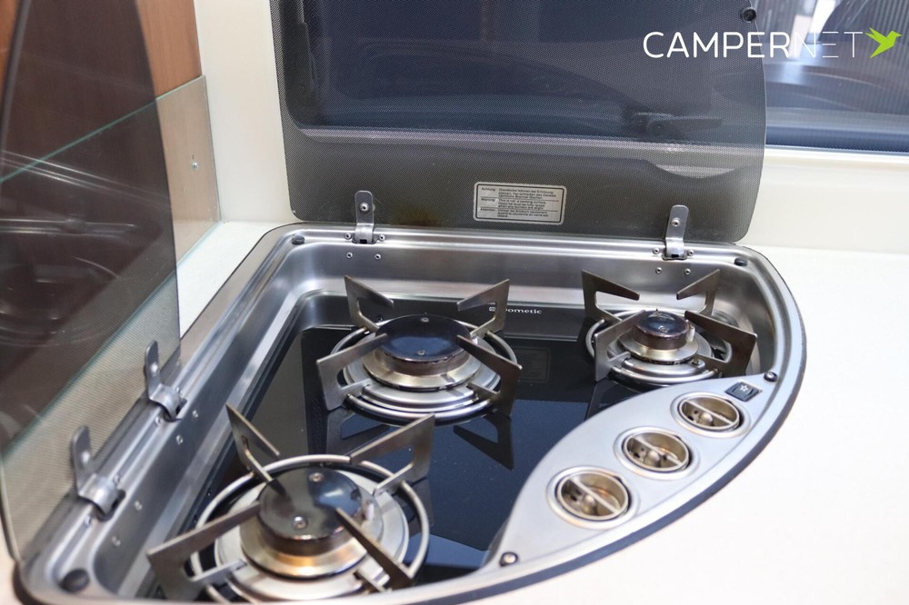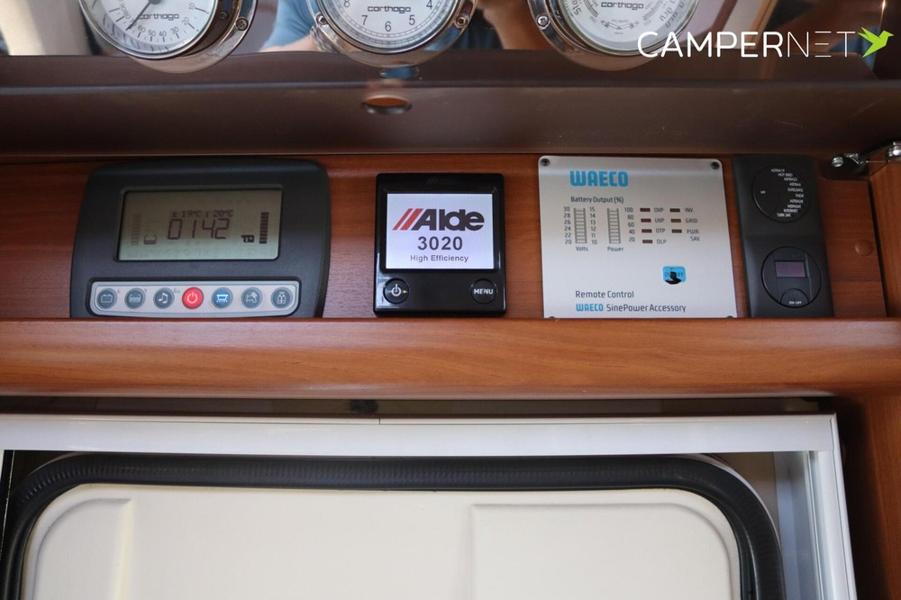 De ruime hoekkeuken biedt veel opbergruimte met talloze lades, een 3-pits gasstel met ontstekingsautomaat en een grote koelkast en vriesvak. De camper is verder uitgerust met extra opties, zoals : zonnepanelen, LPG met buitenvulling, Alde verwarming, omvormer en nog veel meer.
