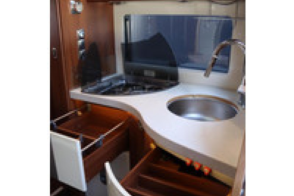 Deze luxe camper biedt een zeer complete uitrusting, met een ruime indeling en bijzonder veel kastruimte.