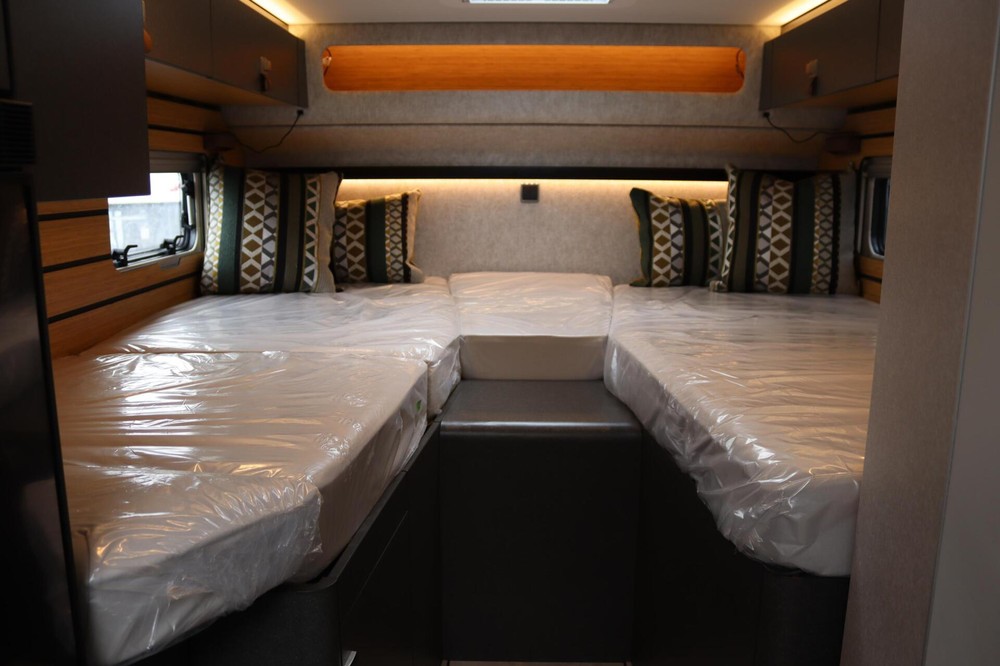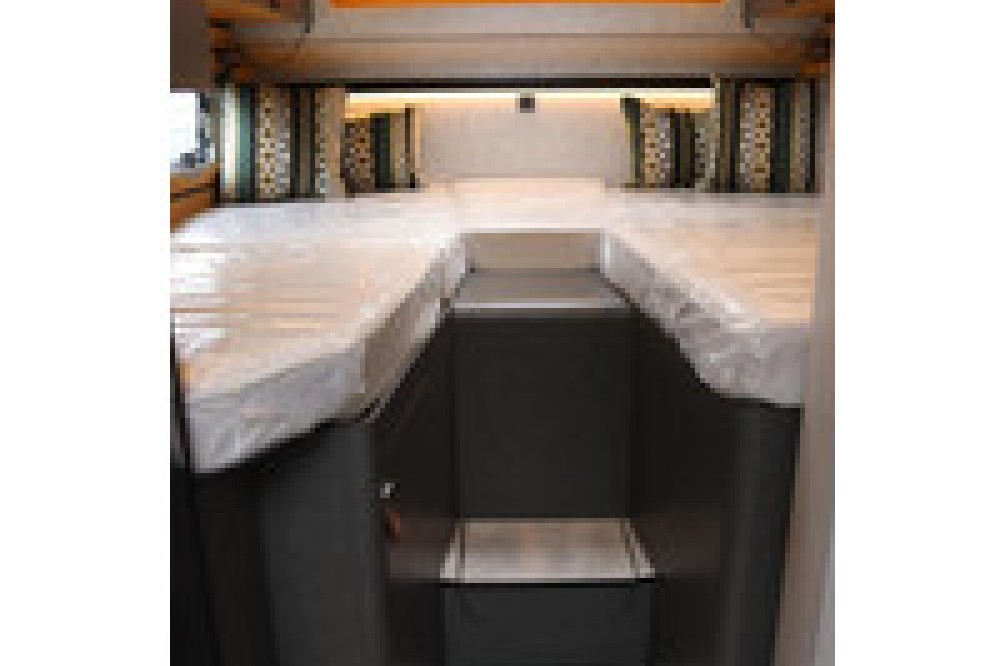 Slaapruimte. Op het systeem met schotelveren slaapt u hemels en heeft u plaats in overvloed. Met het tussenstuk wordt het bed zelfs een ligweide.