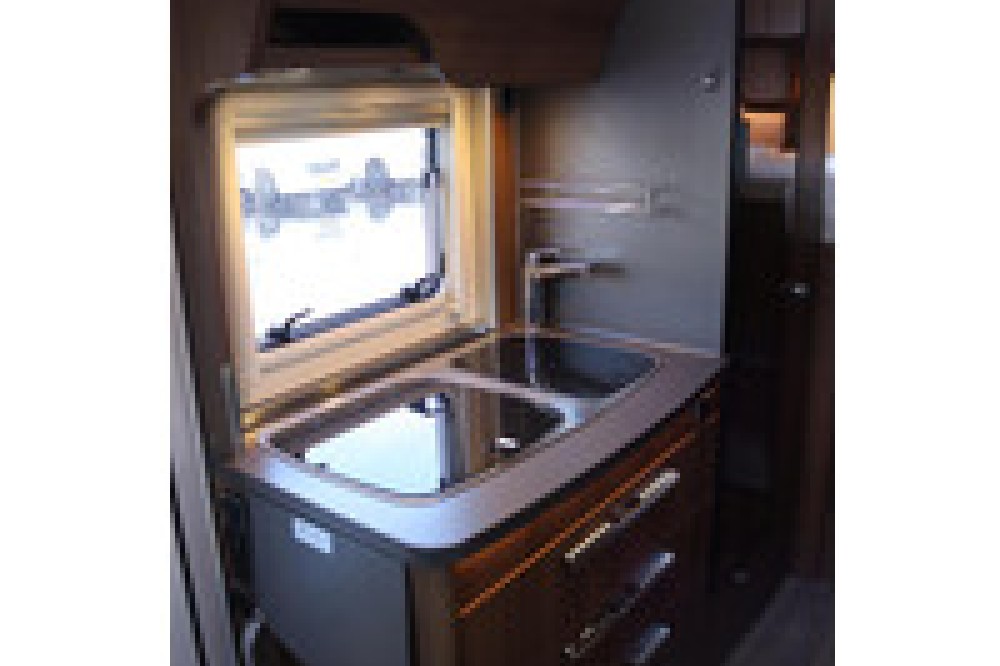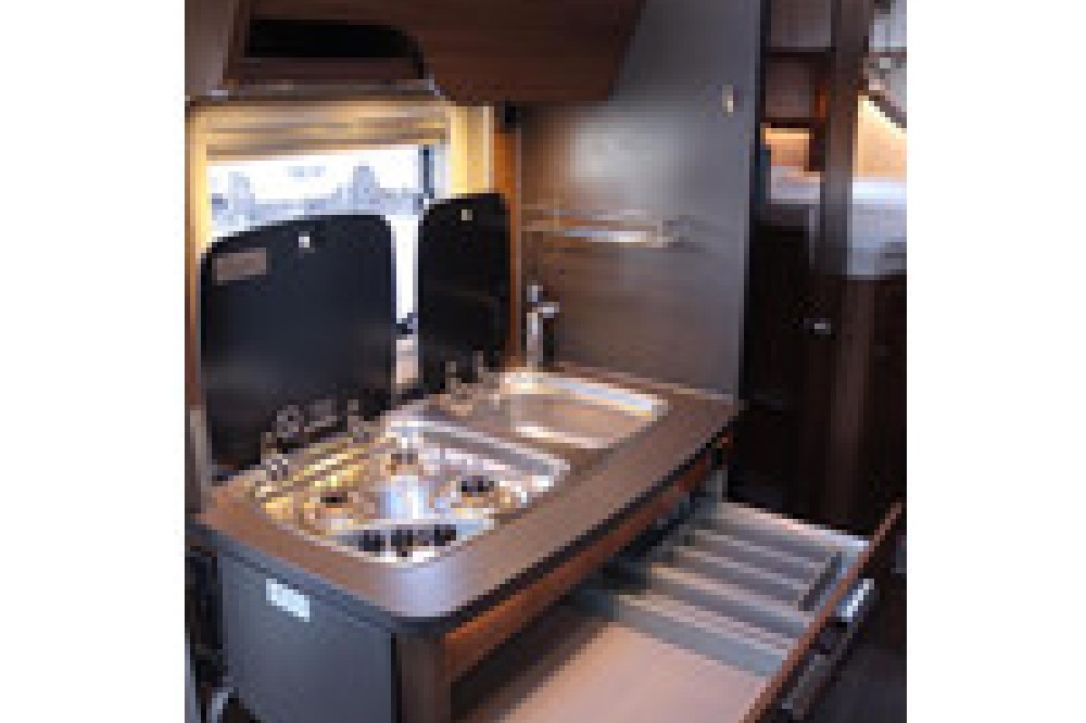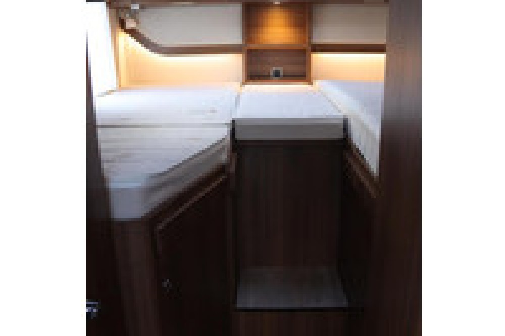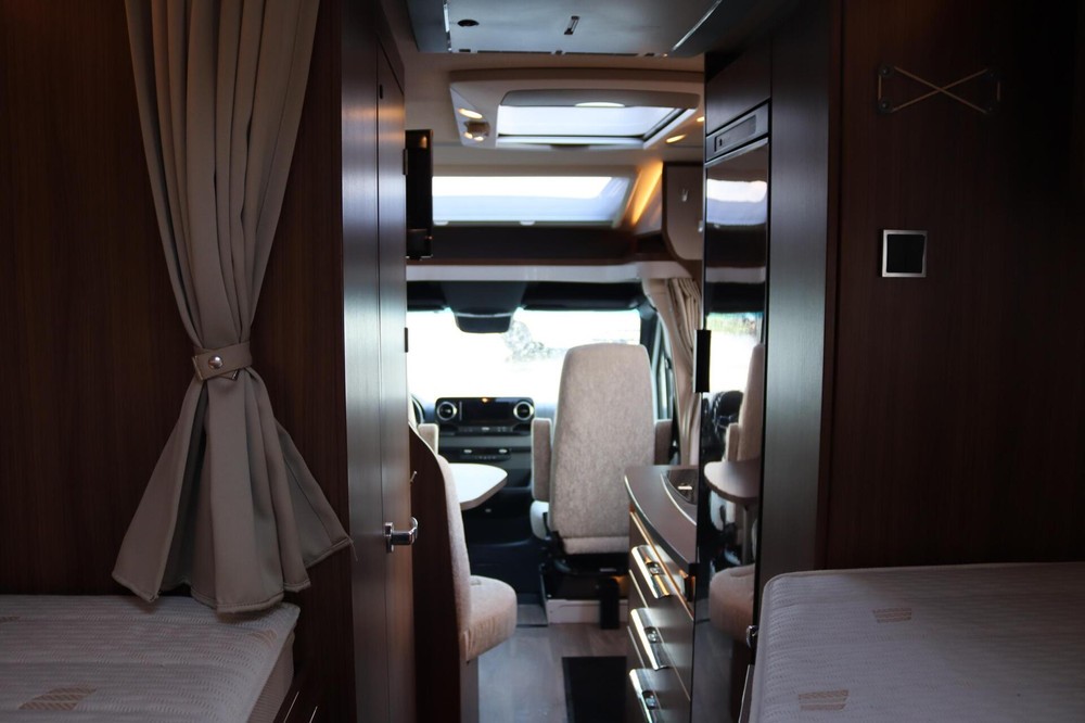 Het interieur van de camper straalt warmte en luxe uit met de donkere houten afwerkingen. Geniet van een goede nachtrust in de comfortabele lengte bedden. De grote garage biedt volop ruimte voor al uw bagage en kampeerspullen, ideaal voor lange reizen.