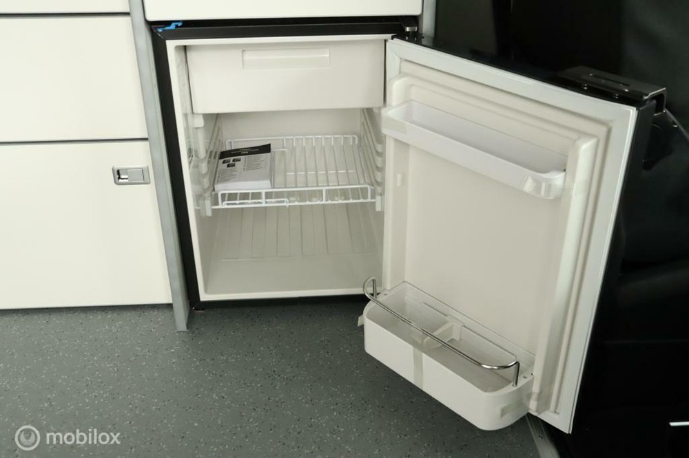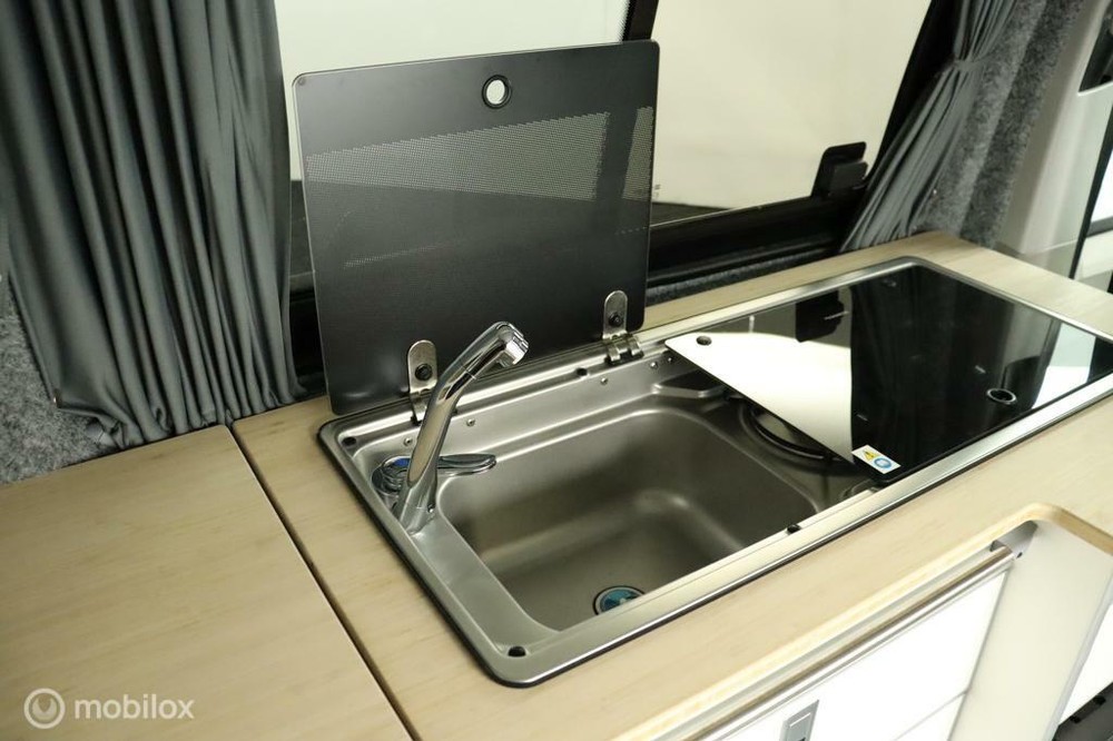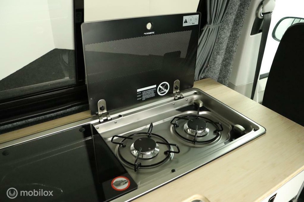 keukenblok bestaat uit een spoelbak met schoon en vuilwater tank en een 2 pits gasstel. Verder een besteklade, dometic compressor koelkast met vriesvakje koelvak heeft een inhoud van 45 liter en verschillende opbergvakjes.