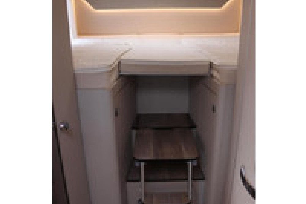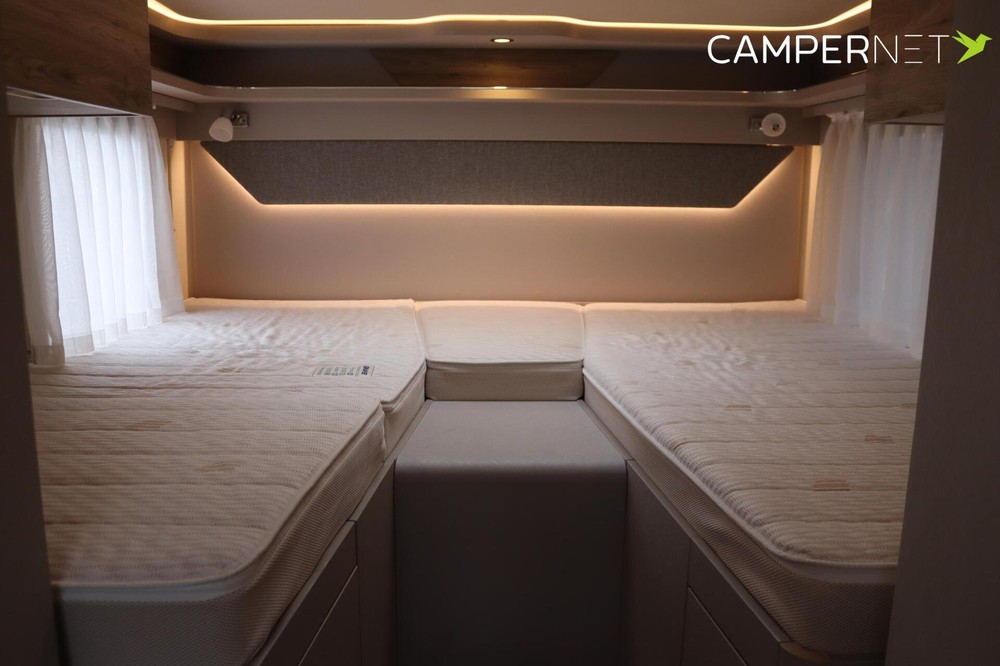 Complete integraal Hymer Exsis-I 580 Pure. Met een badkamer om je goed in te voelen. De ruime comfort badkamer is uitgerust met een grote douche met houten lattenbodem en een comfortabel zittend toilet. Verder de meer dan 1,90 m lange eenpersoonsbedden achterin kunnen dankzij de standaard extra bekleding tot één grote bed worden omgebouwd. De geïntegreerde comfortladder zorgt voor een gemakkelijke toegang tot het grote achterbed.