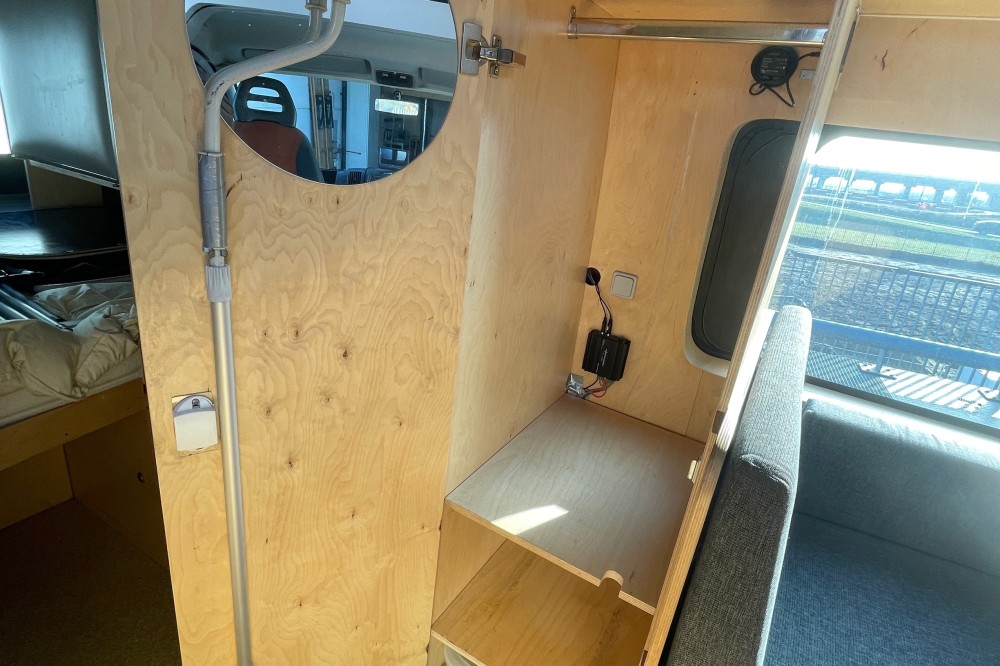 Dankzij de zeer doordachte indeling beschikt de camper over uitzonderlijk veel bergruimte: in de hangkast, onder de hangkast én in de kastjes op ooghoogte, zonder dat dit ten koste gaat van de leefruimte.