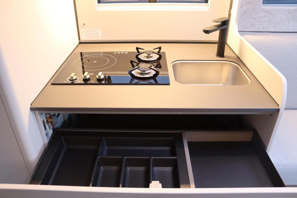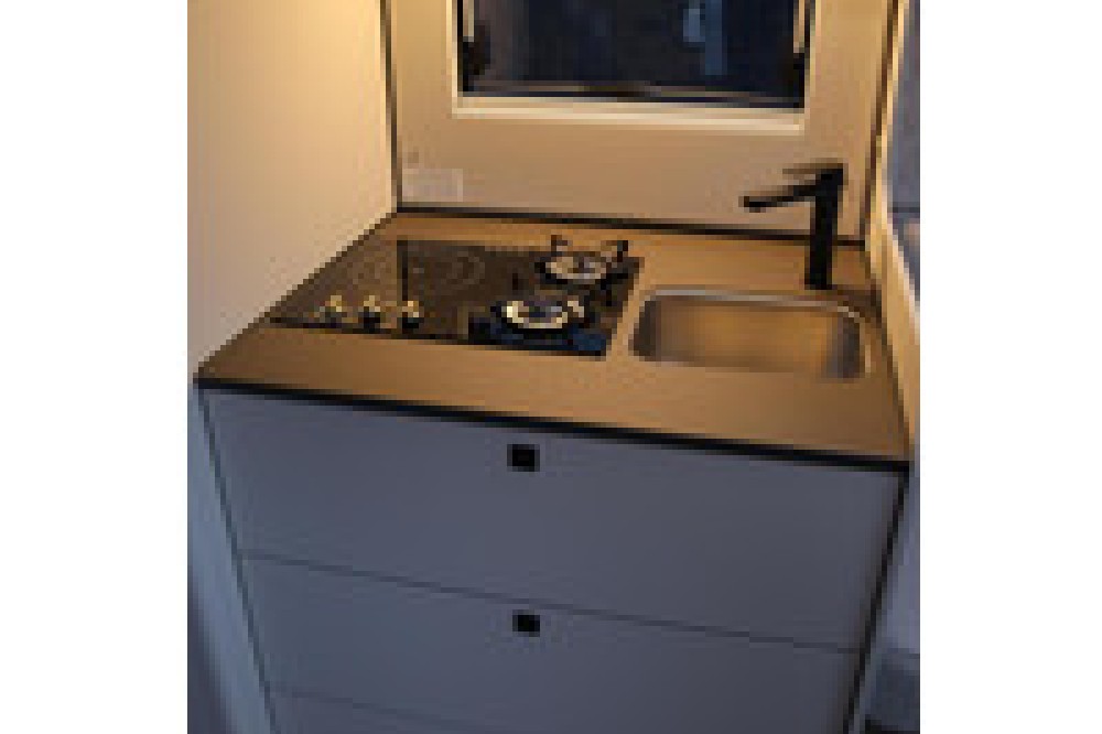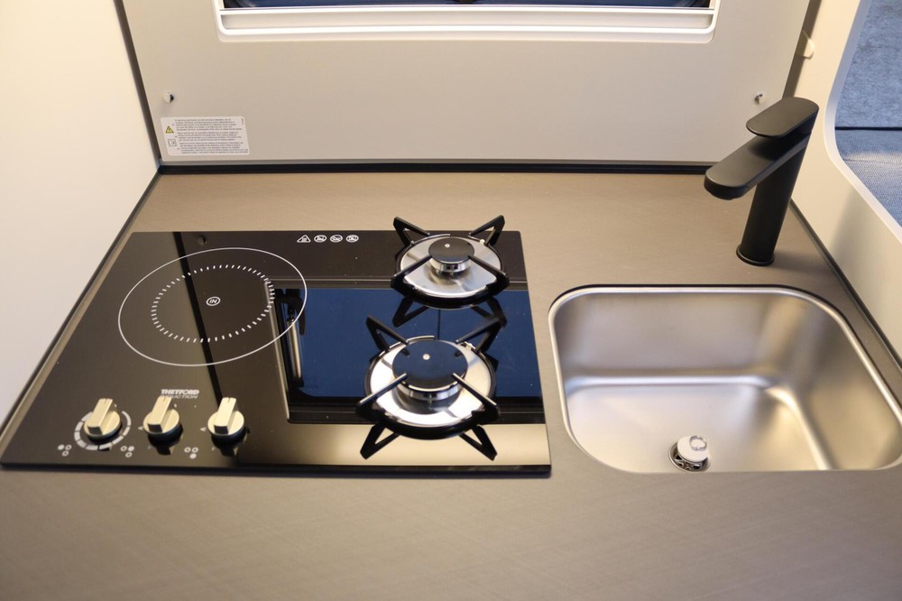 Koken zoals u het wiltDe keuken is uitgerust met twee gaspitten én een inductieplaat, ideaal als u onderweg wilt variëren. De spoelbak is voorzien van houders voor gastronormbakken en ook het bekende