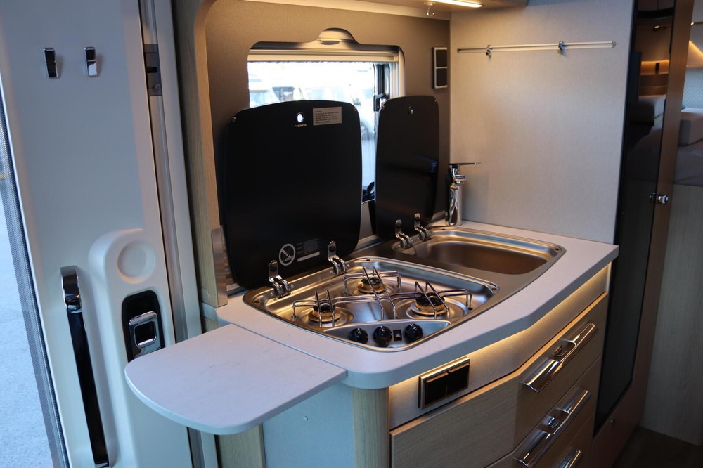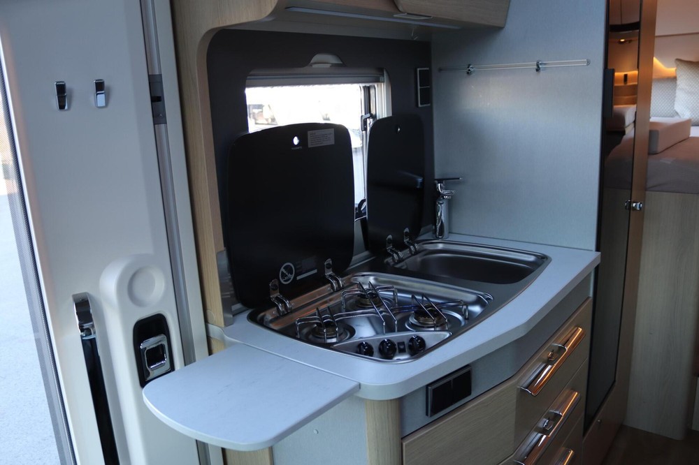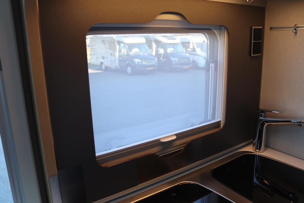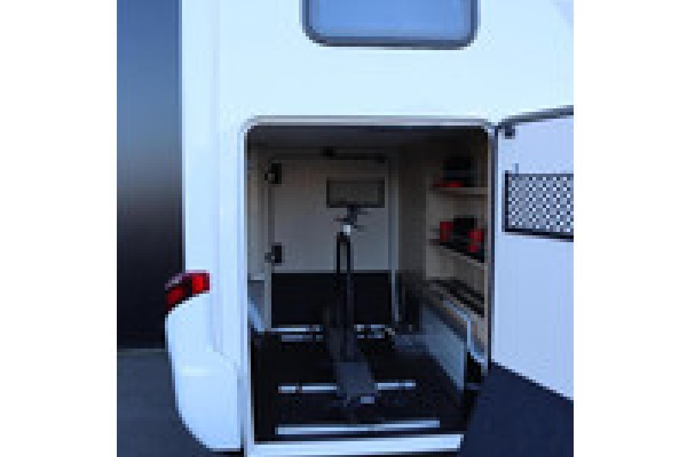 Luxe en praktische detailsDe Hymer BMC-T 580 biedt een ruime zithoek met een L-zit die ontstaat door de luxe draaibare voorstoelen. Het elegante Grand Oak meubeldecor in combinatie met de luxe Janeiro bekleding zorgt voor een verfijnde uitstraling. Dankzij de dubbele bodem, die verwarmd is en extra opbergruimte biedt, kun je jouw spullen veilig en droog opbergen. De 180 liter schoonwatertank en de 150 liter vuilwatertank zijn weggewerkt in de dubbele bodem, terwijl je vanuit de buitenkant eenvoudig toegang hebt tot de opslagruimte. De ruime garage heeft een laadhoogte van 132 cm, is aan beide zijden toegankelijk en biedt voldoende ruimte voor uw fietsen, scooter en bagage.