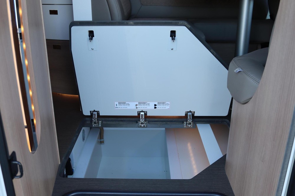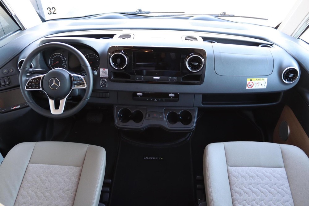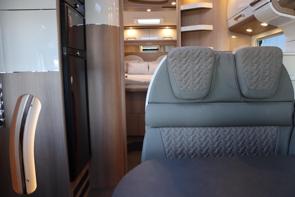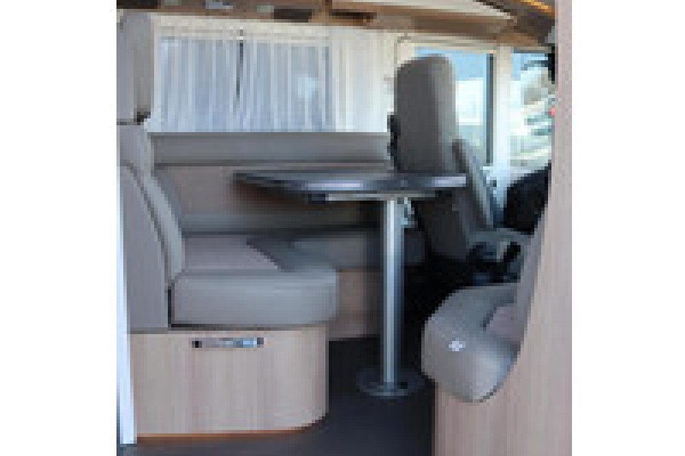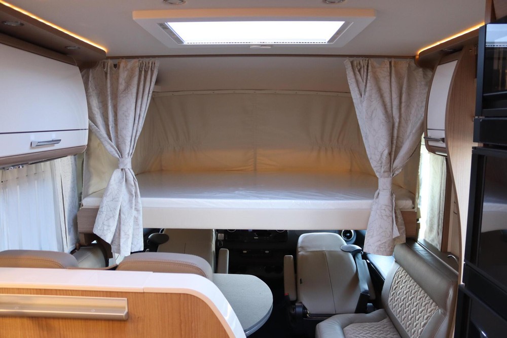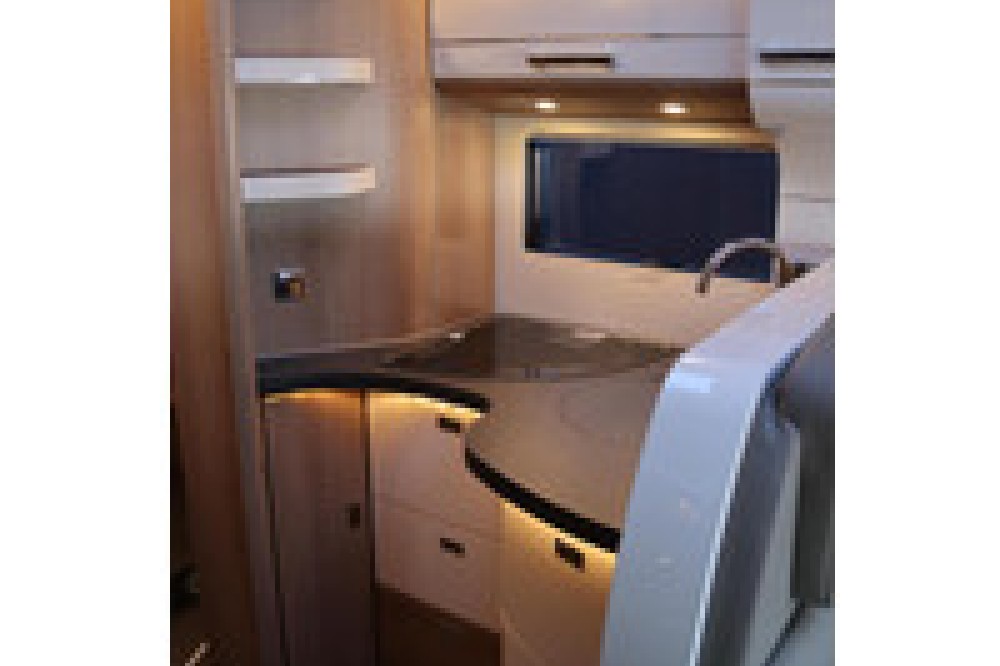 Deze camper biedt een zeer comfortabele indelingen: Grote L-zitgroep met brede kantelbare zijbank in woonkamer die bekleed is met deels leder Macchiato bekleding .In het midden vindt u een Comfort-hoekkeuken met gebogen werkblad en sfeerverlichting in de vloerplinten
