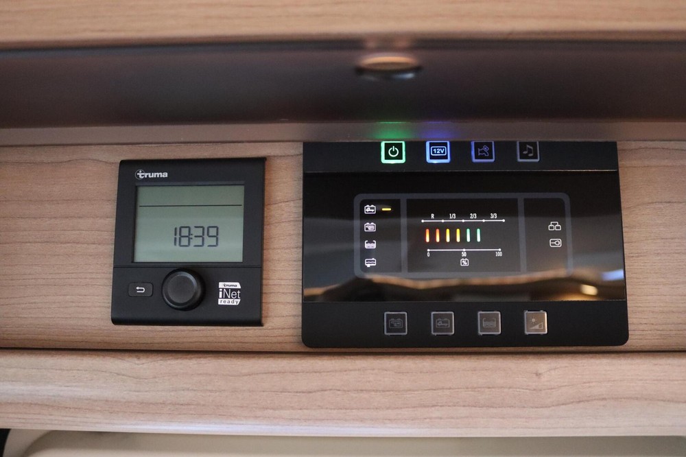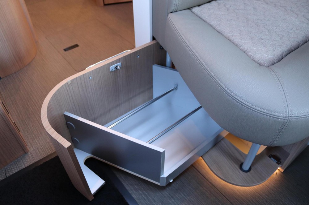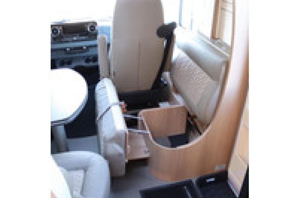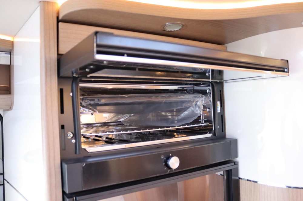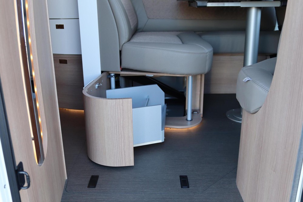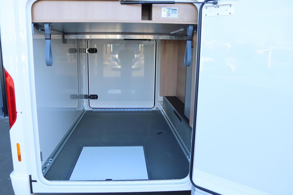 Deze camper biedt een zeer comfortabele indelingen: Grote L-zitgroep met brede kantelbare zijbank in woonkamer die bekleed is met deels leder Macchiato bekleding .In het midden vindt u een Comfort-hoekkeuken met gebogen werkblad en sfeerverlichting in de vloerplinten