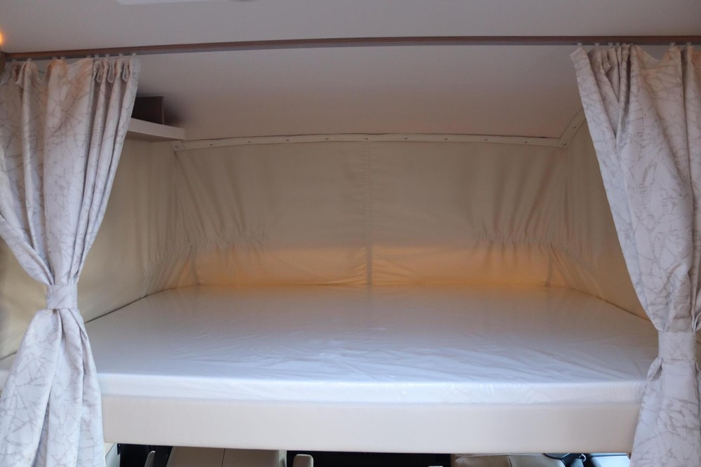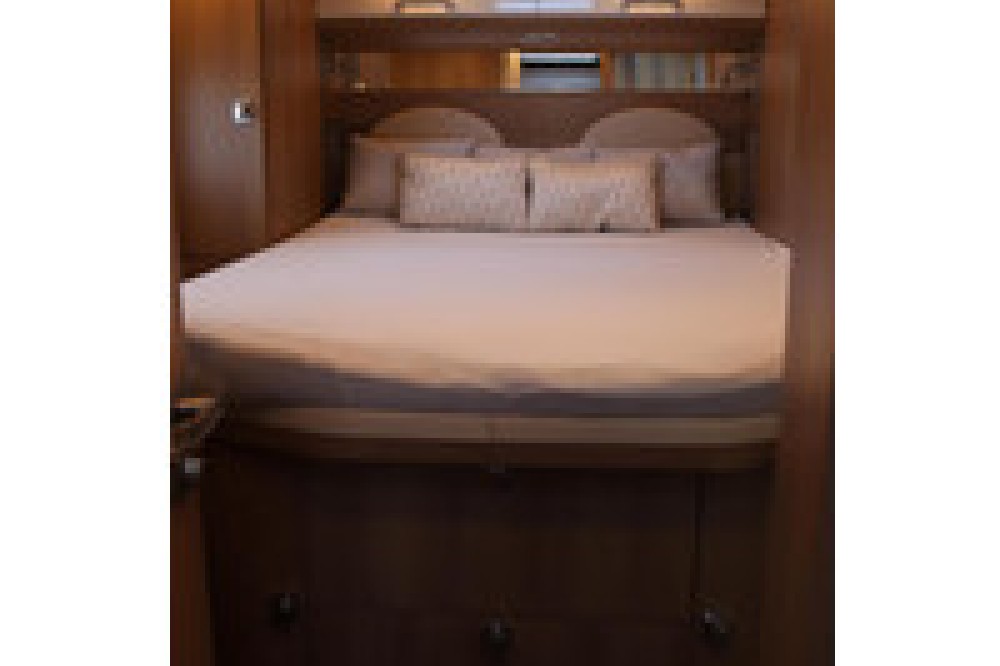 Het slaapgedeelte is uitgerust met een groot Queensbed waarvan de hoofdsteunen omhoog kunnen klappen waardoor er meer ruimte is om langs het bed te lopen. Ook zijn er veel kasten en lades in en rond het bed.